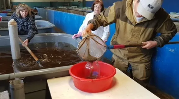 Чтобы рыбы не погибли от перепада температур, сначала специалисты рыбзавода поместили мальков в воду непосредственно в капсулах. И только после того, как температура воды в капсуле достигла речных показателей, мальки были выпущены в реку.