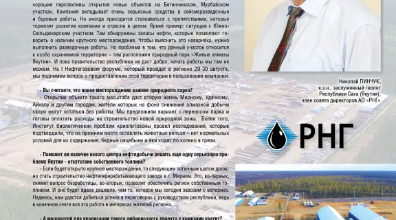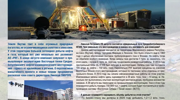 Земля Якутии таит в себе огромные природные богатства, не ограничивающиеся золотом и алмазами. У этой территории большой потенциал добычи нефти и газа, который вот уже несколько лет развивает АО «РНГ». В конце августа компания запускает в промышленную эксплуатацию Восточные блоки Среднеботуобинского нефтегазоконденсатного месторождения – одного из крупнейших в регионе. О перспективах масштабного проекта и новых планах предприятия рассказал член совета директоров Николай ПИНЧУК.